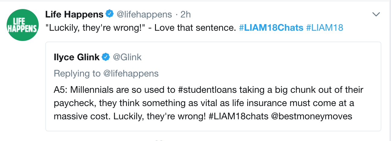 So many people get down on Millennials, telling them they are doing just about everything wrong. That’s why when Life Happens and LIMRA did a joint Twitter chat for Life Insurance Awareness Month #LIAM18Chats, people had a lot of good insight and some great advice for Millennials about how to think about life insurance.