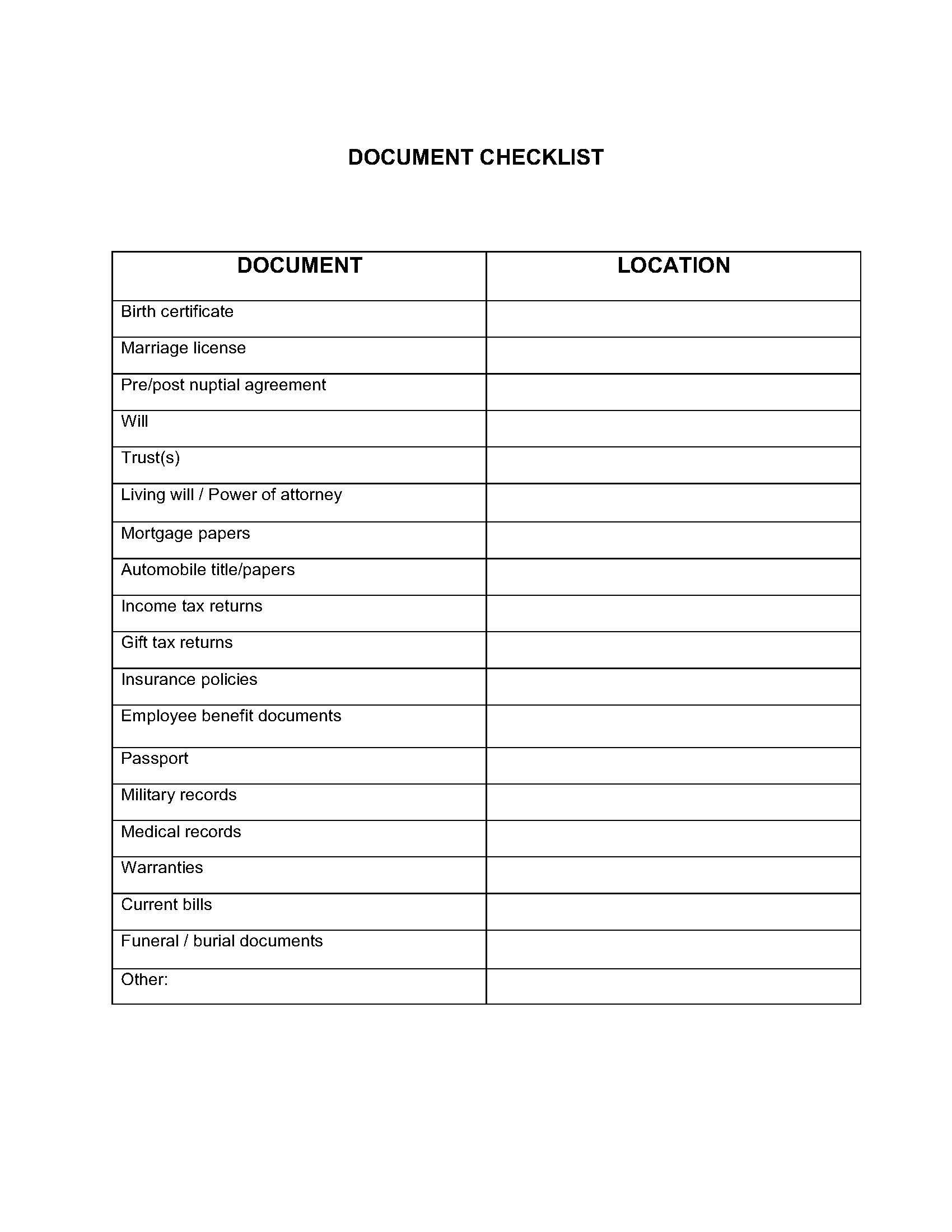 Do you have your legal and financial documents stored (maybe stashed) in various places around your home? Some in a desk drawer? Others in your closet? Some in a safe? Even more in a file cabinet in the basement? It’s time to get a handle on all your documents and store them safely, noting the location. You can use this list as a starting point, and also as a reminder to follow through on moving any of these documents or tasks from your “to do” list to your “it’s done” list!